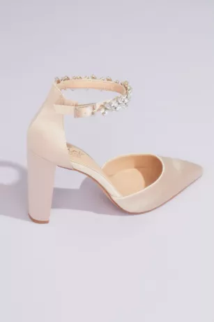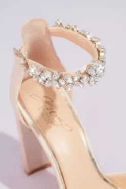 Let love sparkle in these elegant satin shoes, featuring crystal embellishments on the adjustable ankle strap and block heels to keep you comfortable all night long.