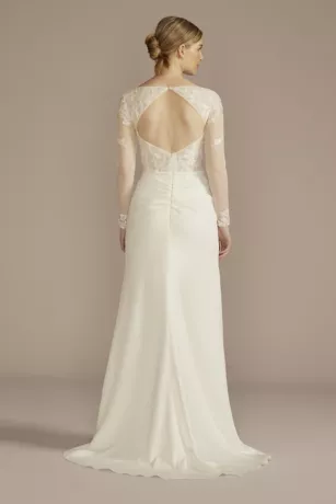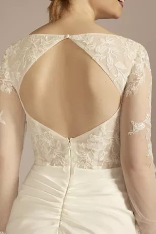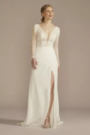Thoughtfully designed with recycled lace fabric, this timeless-with-a-twist wedding dress features a beaded bodice, sheer mesh sleeves, and plunging V-neckline. A dramatic side slit shows off your favorite shoes.