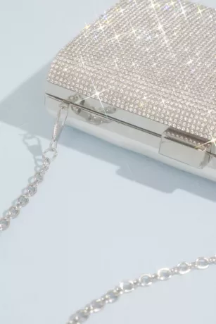 This ultra-chic clutch features a structured silhouette that hinges open with rhinestones embellished across the front and a satin back.