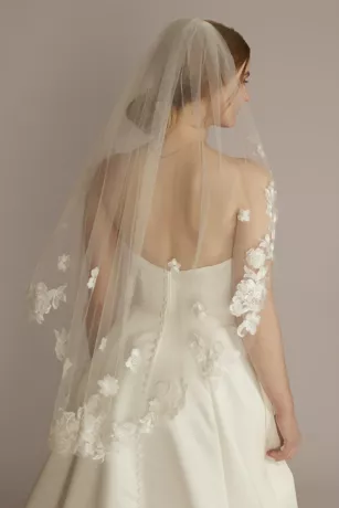 Gorgeous embroidered rose appliques along the edge and scattered up the back of this mid-length tulle veil gives your bouquet some lovely competition.