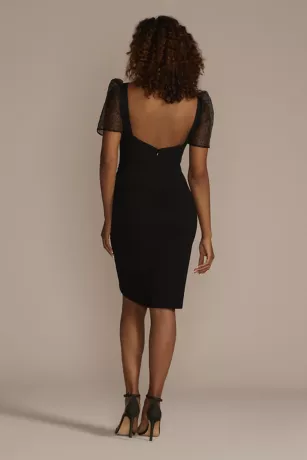 Flirty perfection for date night, GNO, or just because, this crepe LBD comes with a few twists up her gorgeous sleeves. Statement pindot sleeves add volume to the sheath silhouette, while allover ruching shows off your figure.