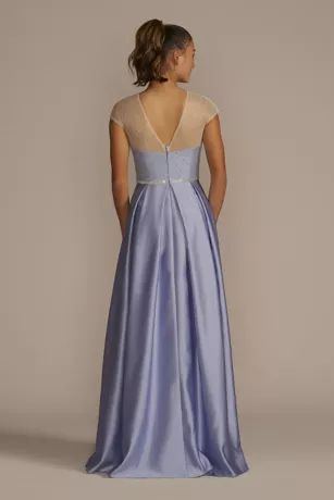 On this prom-perfect satin ball gown, sparkling embellishments sit atop a sheer cap sleeve top, revealing a gorgeous sweetheart neckline. Trim at the waist highlights the beautiful shape, while pockets ensure no necessity is forgotten.