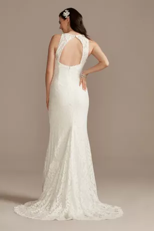 Crafted of a stretch lace fabric and detailed with hand-cut scallops at the hem, this sheath wedding dress is both comfortable and romantic. A flattering halter neckline and an alluring keyhole back complete the look.