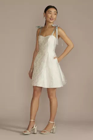 Get party-ready in a sassy sweetheart jacquard dress. The short A-line hem showcases your heels while skirt pockets allow for easy stashing of your must-haves. Customize your look with interchangeable white or blue shoulder-tie straps, or wow in a strapless number.