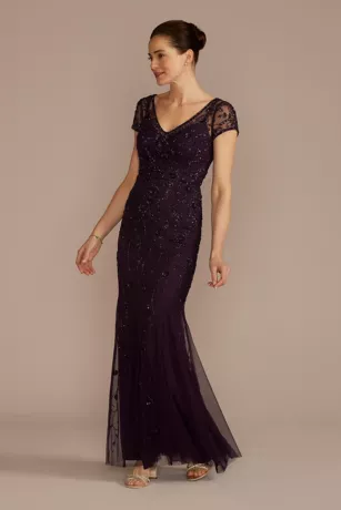 Swirls of sparkling beads define this elegant sheath dress, perfect for any mother of the bride or groom. Illusion short sleeves help the striking design stand out, while a flowy, godet-inset skirt ensures you’ll never blend in.