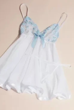 Daintily detailed with soft blue satin ribbon and tied with a bow, this sheer chiffon baby doll is the perfect combo of sexy and sweet. Paired with a matching G-string panty, this lingerie adds a special touch to your wedding night, honeymoon, or any occasion.
