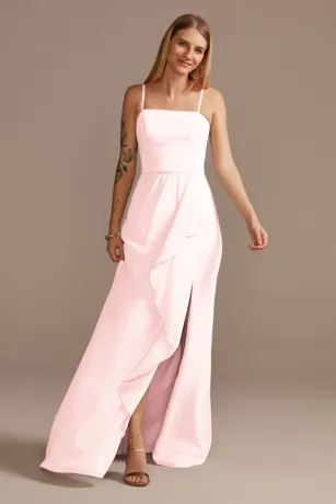 Delicate spaghetti straps, a squared neckline, and a statement ruffle give this chiffon bridesmaid dress a modern boho feel.