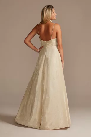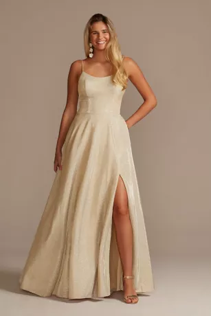 Glitter amplifies the brilliant sparkle of this high-shine spaghetti strap gown, finished with a dramatic skirt slit. Ideal for prom or any formal affair.