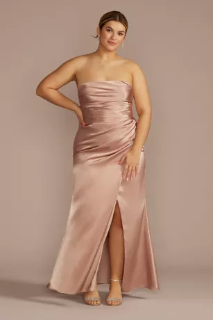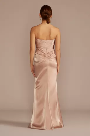 Made with silky, satiny charmeuse fabric, this strapless bridesmaid dress gets its glamour from flattering bodice ruching and a skirt slit.