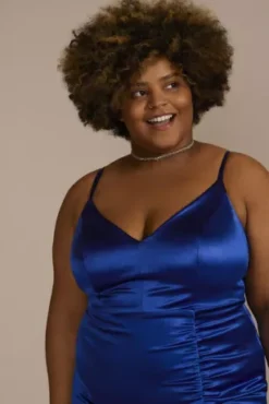 It’s easy to be comfortable as the center of attention when wearing this stretch satin floor length dress. Featuring a flattering v-neckline, a fitted bodice, and a sexy skirt slit, you’ll have the most memorable look of the night.