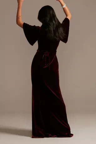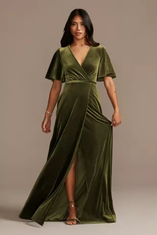 A faux wrap silhouette, waist tie, and skirt slit make this stretch velvet dress a modern bridesmaid favorite. And it has pockets!