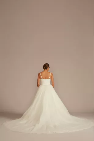 A breathtaking entrance awaits in this brilliant tulle wedding dress. A staggering collection of 46,000 hand-placed sequins, beads, and crystals bejewel 66 yards of fabric. The voluminous ball gown skirt is complete with a dramatic cathedral train for the ultimate fairy tale look.