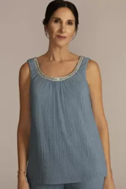 Three-piece ensembles are a comfortably chic choice for any mother of the bride or groom. This head-to-toe look features a rhinestone trimmed metallic tank top, matte chifon pants, and a flowy three-quarter sleeve jacket.