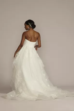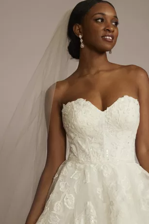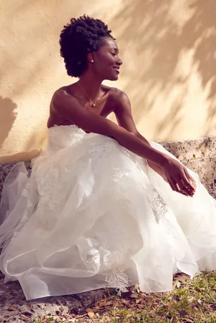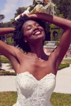 If you’re dreaming of princess vibes, a ball gown wedding dress is a must! It takes nearly 15 hours, four fabrics, 16 yards of organza, and two types of lace appliques to create the full tiered silhouette straight out of a fairy tale. A strapless sweetheart neckline and dramatic chapel train complete the magical aesthetic, no fairy godmother needed!