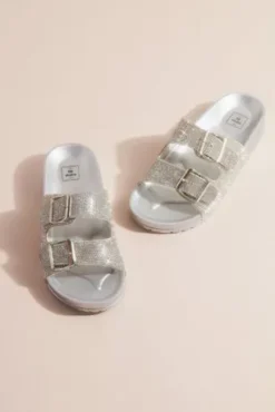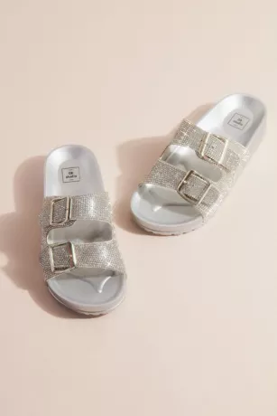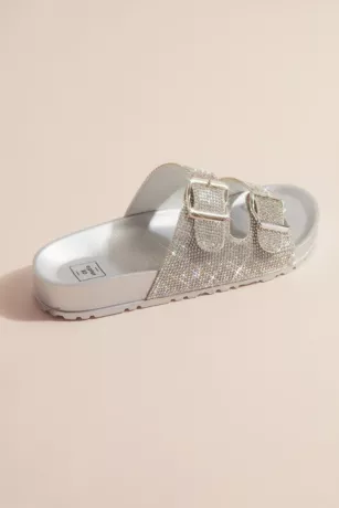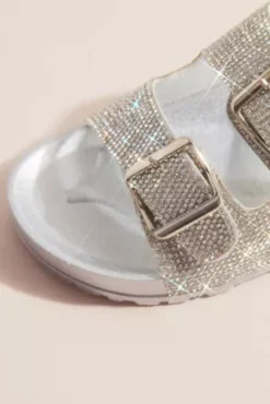 Comfy strolling meets glam statement-making with these crystal-encrusted metallic footbed sandals.